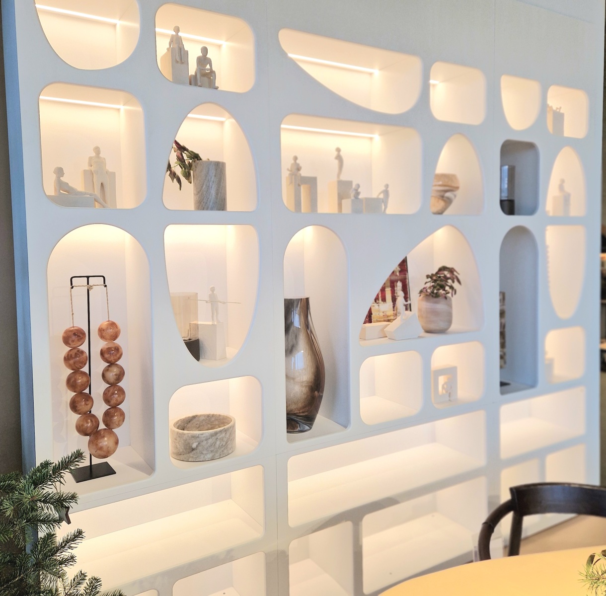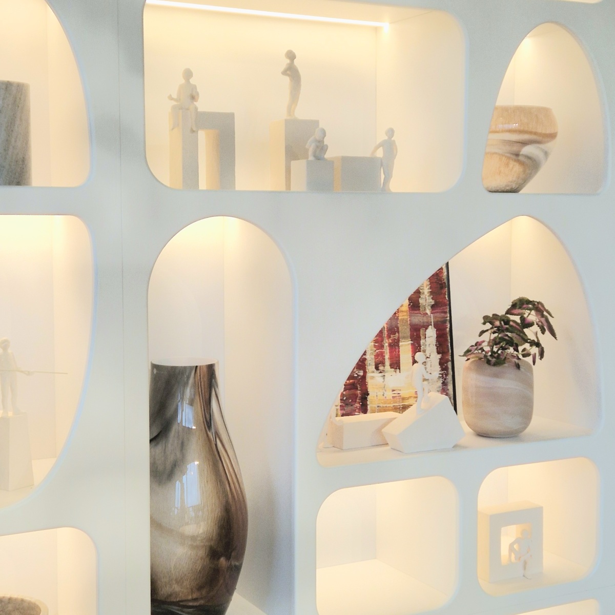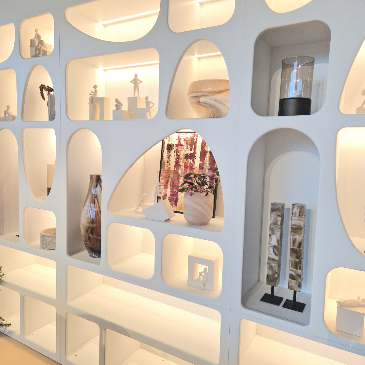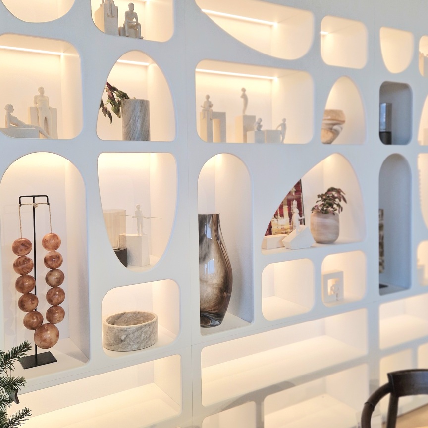 In onze showroom ontdek je een modelkast die ingebouwd is tussen twee muren. Daarom houden we zo van dit modulaire wandmeubel: dit leunt sterk aan bij maatwerk, waarbij onze schrijnwerkers voor de afwerking kunnen zorgen.