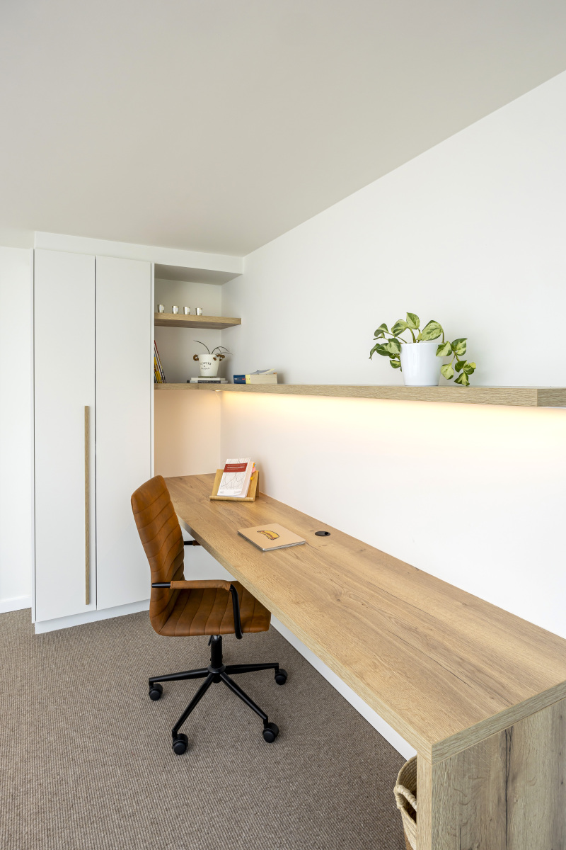 Door samen met onze interieurontwerper na te denken over een goede inrichting krijg je een strakke look zonder storende elementen. Elektriciteitsdraden worden netjes verstopt achter de wanden. Briefwisseling, documenten, kaften en postbakjes krijgen een plek achter de deuren. Een thuisbureau op maat brengt rust in je hoofd en ruimte voor je werk.